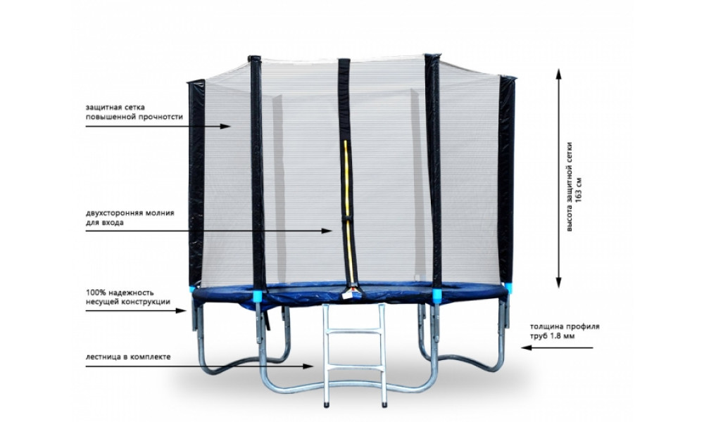 Уличный батут MOOVE&FUN диаметром 8 футов (2,44 метра) с защитной сеткой и лестницей. Для повышения надежности и безопасности наши батуты отличаются усиленной конструкцией, в частности увеличена толщина и надежность всех трубчатых элементов.