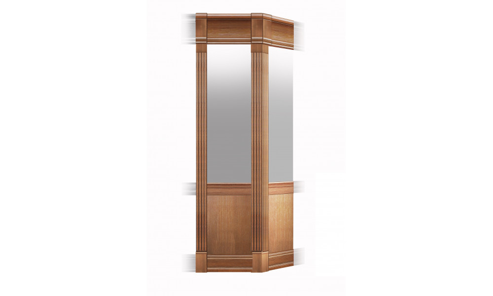 В собранном виде интерьерные панели закрывают нижнюю часть стены и верхнюю область карниза. Узел угловой деревянных панелей "Стандарт" включает в себя: карниз; горизонтальные направляющие; плинтус; вертикальные направляющие; доборные панели, которые монтируются на месте с учетом размера и рельефа прилегающей стены.